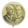 Printed, celluloid-covered, "cello," lapel pins such as these became popular in the campaign of 1896. Most earlier campaign portrait buttons were made by fastening actual photographs on metal or cardboard onto a pin or stud. The stamped metal images, "medals," commonly used in pre-1896 campaigns were largely discontinued after the 1890s. Halftone printing, developed around 1890, quickly replaced photographs on campaign items. | |||||||||||||||||||||